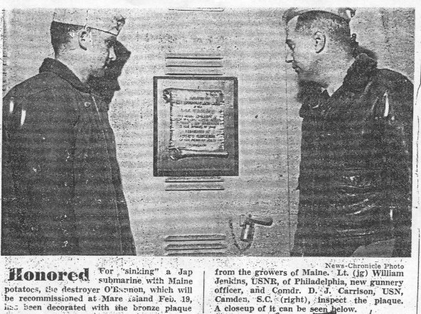 Yes! I could see the Japs running around, Yes! Since we were not at general quarters there were men just looking at the sub and they started to take potatoes from the bins or lockers and started to throw them at the sub. At this time we had the squadron commodore aboard and he kept yelling at Capt. Mac to ram the sub, but Capt. Mac was yelling we cannot, for we do not have the cutting bow, but the commodore kept YELLING RAM THEM, good thing he did not, God only knows what would have happened to us if he did. For spotting the sub, 1st Class Sonar man CHARLES CONN was promoted to Ensign and left the mighty OBannon for officers school. I can see him now a big guy, yes, I remember the first cruise like it was yesterday.