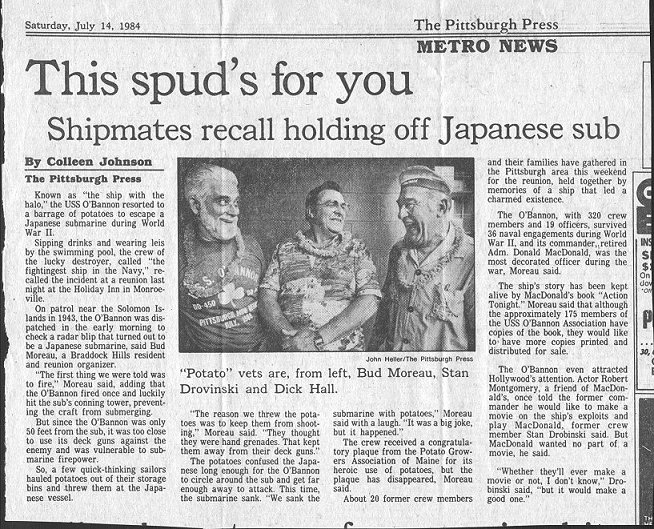 The submarine was equipped with a 3 inch deck gun and the sub's captain finally decided that now was probably a good time to make use of it. As the Japanese sailors ran toward their gun, our deck parties reached into storage bins that were located nearby, picked out some potatoes and threw them at the sailors on the deck of the sub. A potato battle ensued. Apparently the Japanese sailors thought the potatoes were hand grenades. This kept them very busy as they try to get rid of them by throwing them back at the O'Bannon or over the side of the sub. Thus occupied, they were too busy to man their deck gun which gave us sufficient time to put a little distance between our ship and the sub.