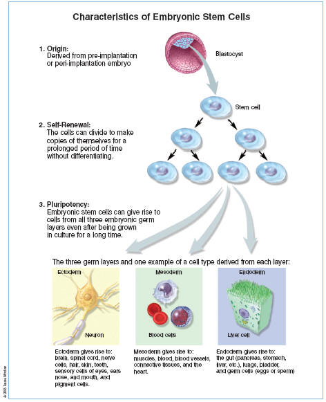 There are over 200 specialized types of cells in the human body (Health Canada, 2004). Stem cells are called pluripotent meaning they can differentiate into almost all cell types or multipotent meaning they can differentiate into many types. Figure 1 lists many cells that embryonic stem cells differentiate into. Stem cells in adults tend to be slightly more specialized than those in embryos and so are called multipotent rather than pluripotent. Scientists still do not understand very well the conditions necessary to differentiate stem cells into different types of cells. These conditions may be internal signals from genes, external signals such as chemicals secreted by other cells, physical contact, or other molecules in the environment, or they may be a mixture of both. (NIH & DHHS, Stem cell basics, 2006)