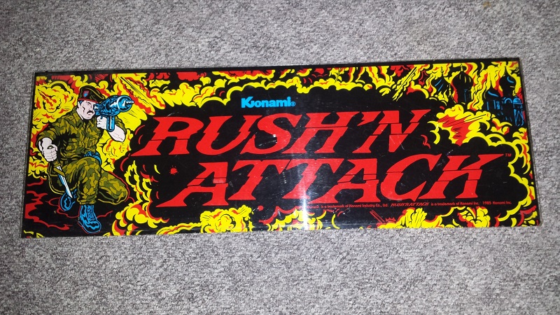 Used Rush'n Attack Marquee. Measures 23 3/4 inches wide by 8 1/8 inches tall. In good condition.