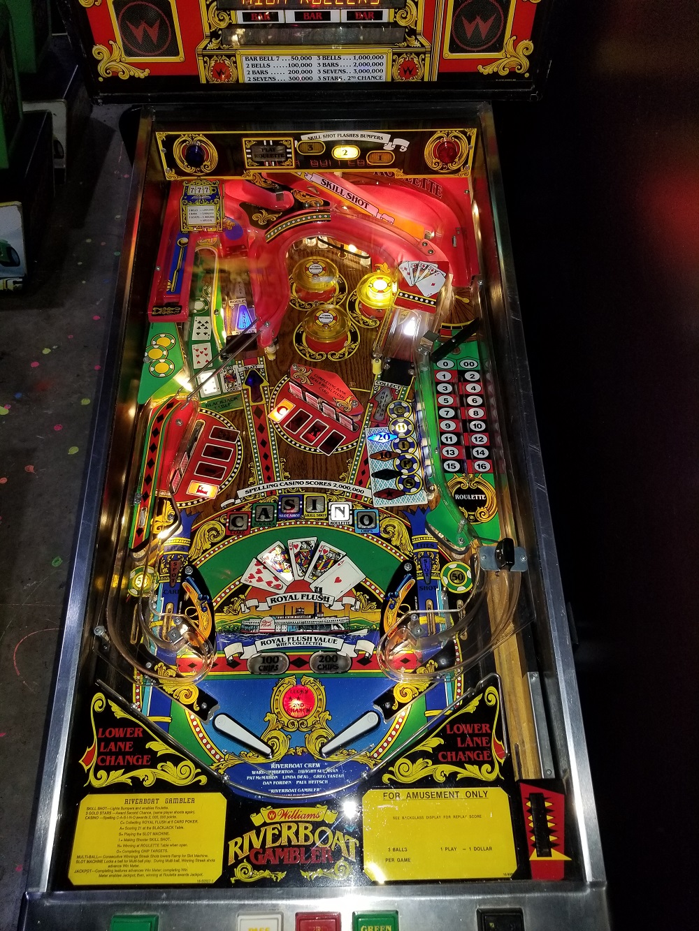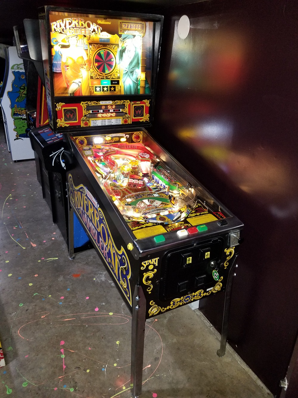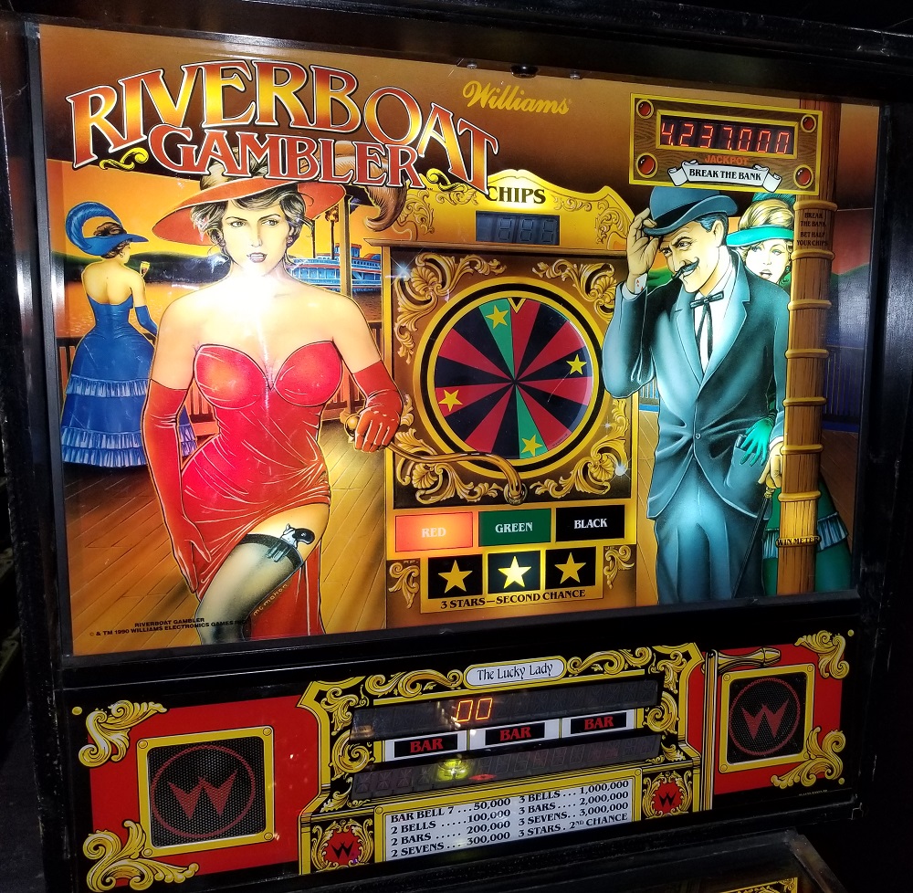 Riverboat Gambler is a gambling themed pinball machine produced by Williams. Pinball machine designer Mark Ritchie reportedly sings the song that plays during the game, whose gravel-voiced,