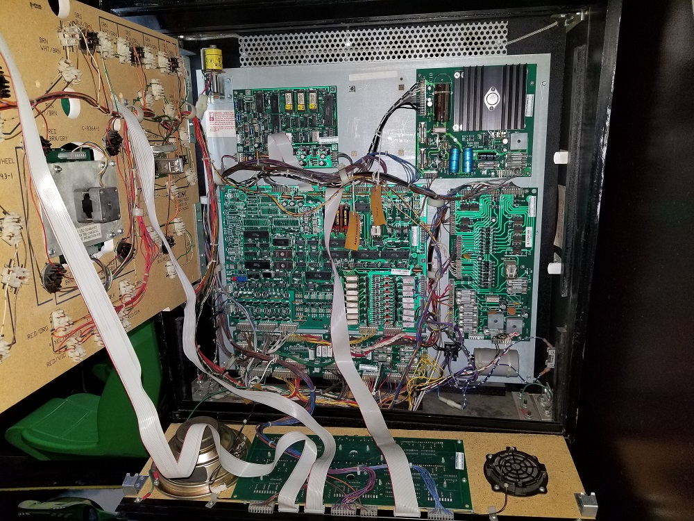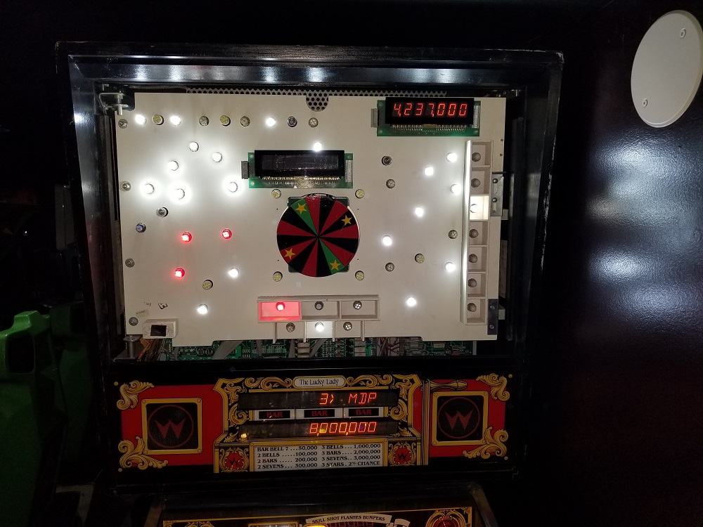 In the center of the head of the machine, a vertical roulette wheel operates more like the Wheel of Fortune than an actual roulette wheel and does not have a ball. 7 of 16 sections are black, 7 are red, which alternate,