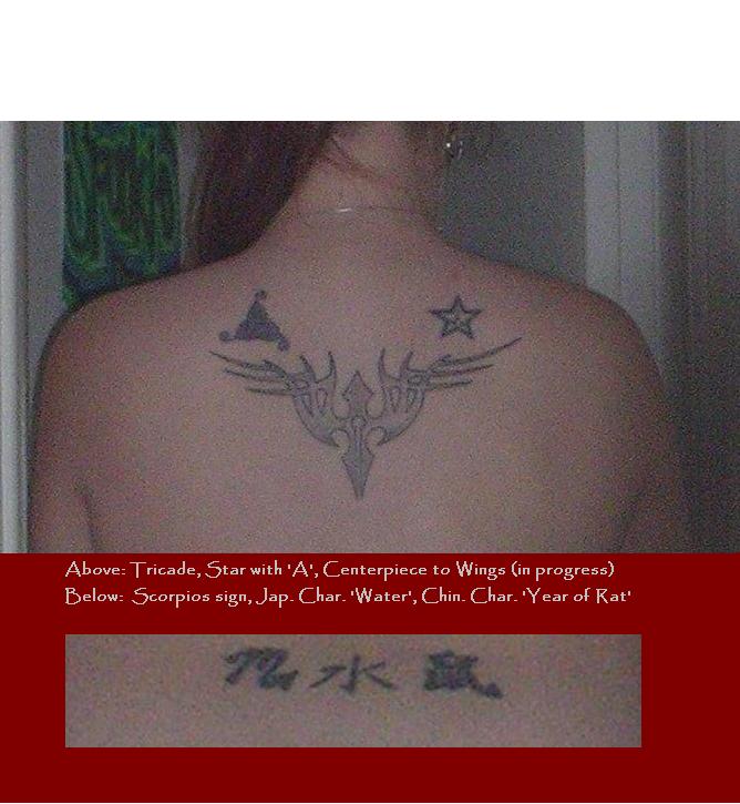 I also have 6 tatoos (see pics bottom of page): left sh.= Double Tricade knotwork; Rt. sh.= Star with 'A' in the center; Center Back= Start of my Tribal Wings back piece; Lower back(left to right)= scorpio sign, Japaneese character for Water, Chineese year of the Rat. I plan to finish the wings and then get a blue waterdragon down my right hip and thigh to my knee. *^_^* I'm excited!!