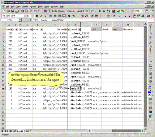 เมื่อเรียก xlGrepMon แล้ว ให้ทำเครื่องหมายถูกที่ checkbox ในชีท res2 เพียงแต่เลือกเซลล์ที่ เป็นผลลัพธ์การค้นหาที่อยู่ใน column H xlGrepMon จะแสดงรายละเอียดของบรรทัดที่ใกล้เคียงทันที