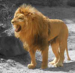 The Lion (Panthera leo) is a mammal of the family Felidae. It is the largest natural living felid with the exception of the tiger. The male lion, easily recognized by his mane, may weigh up to 250 kg (550 lb). Females are much smaller, weighing up to 150 kg (330 lb). In the wild lions live for around 10–14 years, while in captivity they can live over 20.