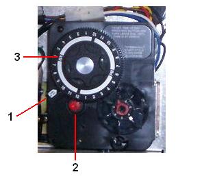2. If the timer is set incorrectly, push the red button in and turn the time wheel until the correct time is across from the "Time of Day" pointer, then release the red button.