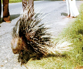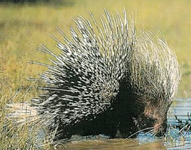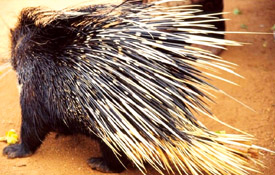 Porcupines are mammals that can be easily recognized as soon as you see them. They have a host of pointed quills on their bodies. These quills are also called spines. Beneath the longer and thinner spines lies a layer of thicker and shorter ones. Quills are modified hair, which grows on their bodies. Earlier we read of pangolins having some of their body hair modified as scales. The hair modifications of the porcupines are totally different to the hair modifications of the pangolin. The porcupine's quills are thin, straight and sharp at the end. The pangolins are flat and broad. Porcupines are found in a number of environments in all parts of the country. They are nocturnal and an agricultural pest. They keep digging for yams, which they relish and being omnivorous, looking for all types of food. This food consists of fruit, grain, roots, tubers, bulbs and all crops. They dig up vegetable gardens and other cultivations and create a lot of damage. They also like to eat carrion. They use their sharp front teeth to gnaw at the bark of trees and bones. Bones are gnawed for calcium, which helps in the formation of their quills. During the day they stay in small caves, crevices and also burrows made by other animals. Porcupine are not seen regularly on moonlight nights.