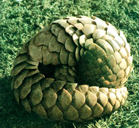 Pangolins are mammals that belong to the Family Manidae and the Genus Manis. This genus comprises of eight species - Indian, Chinese, Malaysian, Pangwan, Giant, Cape, Tree and the Long-tailed, that are spread over in Southeast Asia and Africa. There are four species in Africa and four in Southeast Asia. The pangolin species (Manis crassicaudata) is one of the mammals that are rarely seen in Sri Lanka. The derivation of the name pangolin is from Malay Pang gullin meaning one that rolls up. In Sinhala it is called Kebellawa and in Tamil Allangu. The pangolin is also called the Scaly Ant-eater or, very rarely, 'Armadillo'. The pangolin is found in other Asian countries as well. It is related to the Ant-eater in Africa and the Armadillo in South America. The pangolin in Sri Lanka is strictly terrestrial in that it dwells only on the ground. However, some of the other species are known to climb trees as well.