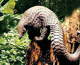 The pangolin is found in many parts of low country going up to about 3,500 feet. I have seen them in the wild in the Anuradhapura, Polonnaruwa and Badulla districts but nowhere in their habitats are they found in large numbers. The colour of a pangolin varies with the colour of the soils of their habitats. It can be a red colour where the soils are red and a gray hue where the soils are that colour. The underparts are a dull white colour. The pangolin is short and about five feet long from head to tail. They have small heads with pointed and elongated jaws. These jaws are tube-shaped and cannot be opened wide. They have small mouths, which have no teeth and therefore they cannot chew on anything. The tongue is long and narrow. Its eyes and ears are small. The tail is long and powerful but the limbs are short. The pangolin is, all in all, a strange looking animal but a very interesting one. The physical appearance of a pangolin is marked by large, hardened, plate-like scales, which are actually mats of hair. The hair is clamped together so tightly and in such a way that makes them look like scales. These scales overlap and are at about 45 degrees to the body. The head, the back and the sides of the body, the whole of the tail and the outside of the limbs are covered with these scales. The under parts are naked or covered scantily with fairly thick hairs. This armour plate of scales is very strong and the scales are very sharp. When the pangolin moves the scales give out a rustling sound. The scales of the young pangolins are soft. They harden as the baby grows older. The pangolin has three main claws on its fore feet, which are long and slightly curved. The feet and toes of the fore feet are very strong. They are much longer and stronger than those on the hind feet. This is to help it to excavate the earth and anthills. A pangolin is capable of digging, anthills etc., very fast. Pangolins in other countries that climb trees find that these claws assist them to climb as well. As a result of the positioning of these claws the pangolin finds it difficult to walk properly. The claws are highly adapted for digging and the mouth is adapted for sucking up ants. The pangolin has a large tail, which helps it to balance when moving about. It is a good swimmer. Pangolins walk in a hunched manner practically on their hind feet with the tail used to keep the balance.