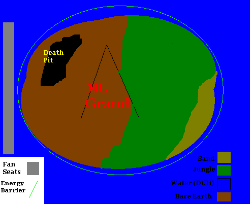 Tim: As you can easily see the arena is split in half, baren wasteland and lush jungle seperated by a mammoth mountain! Also there are traps randomly placed onto the island so it could get interesting. The most obvious trap is the death pit. One big hole filled with stone spikes! There's a load of fans in the crowd today! Mom?