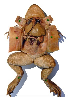 Then open up the skin and pin it down. Then open the muscular abdmonial flaps and pin them down. Next find the thorax ( should be right above the abdmon. Take the scissors and cut it open. Open and pin the thoracic flap down. Now you can examine the interior of the frog with the magnifiying glass and find the organs.