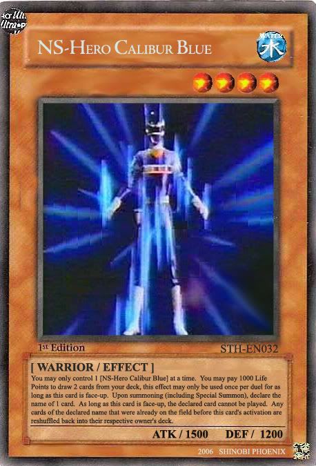 EFFECT: You may only control 1 [NS-Hero Calibur Blue] at a time. You may pay 1000 Life Points to draw 2 cards from your deck, this effect may only be used once per duel for as long as this card is face-up. Upon summoning (including Special Summon), declare the name of 1 card. As long as this card is face-up, the declared card cannot be played. Any cards of the declared name that were already on the field before this card's activation are reshuffled back into their respective owner's deck.