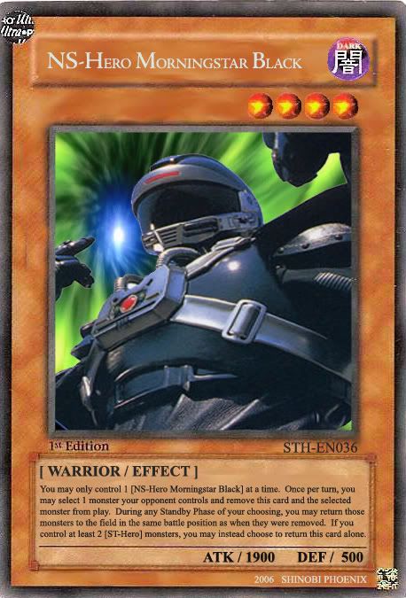 EFFECT: You may only control 1 [NS-Hero Morningstar Black] at a time. Once per turn, you may select 1 monster your opponent controls and remove this card and the selected monster from play. During any Standby Phase of your choosing, you may return those monsters to the field in the same battle position as when they were removed. If you control at least 2 [ST-Hero] monsters, you may instead choose to return this card alone.