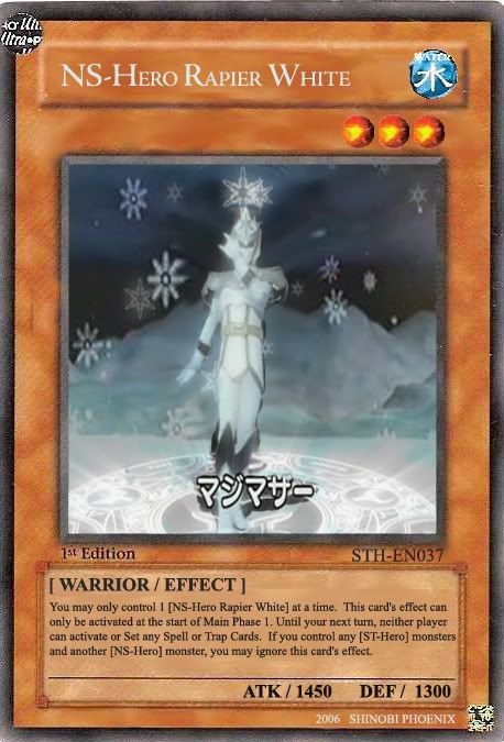 EFFECT: You may only control 1 [NS-Hero Rapier White] at a time. This card's effect can only be activated at the start of Main Phase 1. Until your next turn, neither player can activate or Set any Spell or Trap Cards. If you control any [ST-Hero] monsters and another [NS-Hero] monster, you may ignore this card's effect.