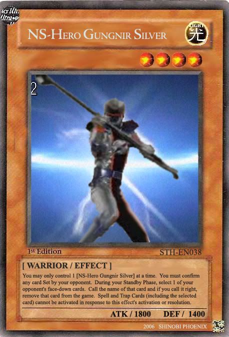 EFFECT: You may only control 1 [NS-Hero Gungnir Silver] at a time. You must confirm any card Set by your opponent. During your Standby Phase, select 1 of your opponent's face-down cards. Call the name of that card and if you call it right, remove that card from the game. Spell and Trap Cards (including the selected card) cannot be activated in response to this effect's activation or resolution.