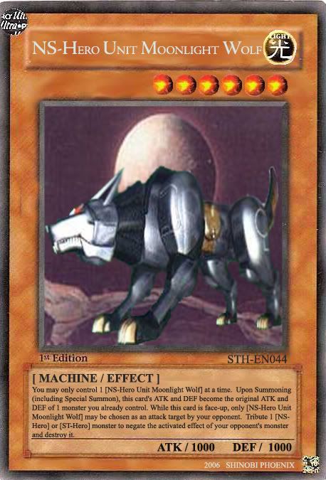 EFFECT: You may only control 1 [NS-Hero Unit Moonlight Wolf] at a time. Upon Summoning (including Special Summon), this card's ATK and DEF become the original ATK and DEF of 1 monster you already control. While this card is face-up, only [NS-Hero Unit Moonlight Wolf] may be chosen as an attack target by your opponent. Tribute 1 [NS-Hero] or [ST-Hero] monster to negate the activated effect of your opponent's monster and destroy it.