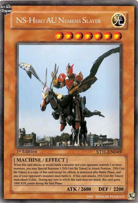 EFFECT: If you control [NS-Hero Unit Stallion Dusk] during your Standby Phase, you may switch it with this card by removing [NS-Hero Unit Stallion Dusk] from the game or switch this card back to the Fusion Deck for a [NS-Hero Unit Stallion Dusk] that is removed from play. While this card is face-up on the field, you can select 1 monster on the field and change it to face-up Attack Position (effects are not activated) and that monster cannot change battle position or be destroyed in battle.