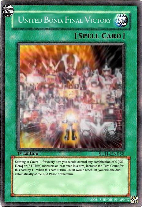 EFFECT: Starting at Count 1, for every turn you would control any combination of 5 [NS-Hero] or [ST-Hero] monsters at least once in a turn, increase the Turn Count for this card by 1. When this card's Turn Count would reach 10, you win the duel automatically at the End Phase of that turn.