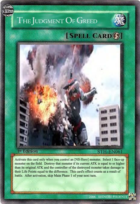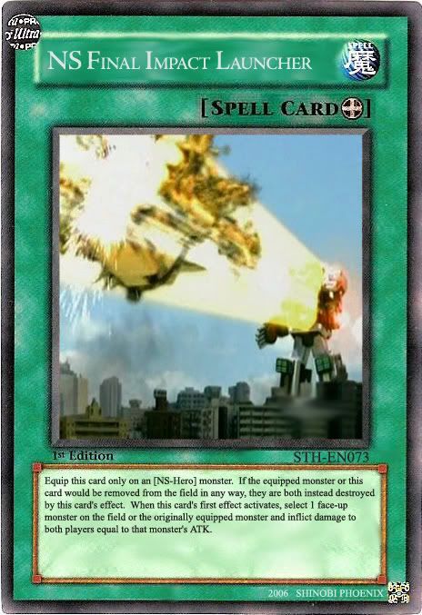 EFFECT: Equip this card only on an [NS-Hero] monster. When activated, place 1 Counter on this card and add 1 Counter at each of your Standby Phases. While equipped, send this card to the Graveyard during your Main Phase to inflict damage to your opponent equal to 500 x (the number of Counters on the card + the number of [NS-Hero] and [ST-Hero] monsters you control).