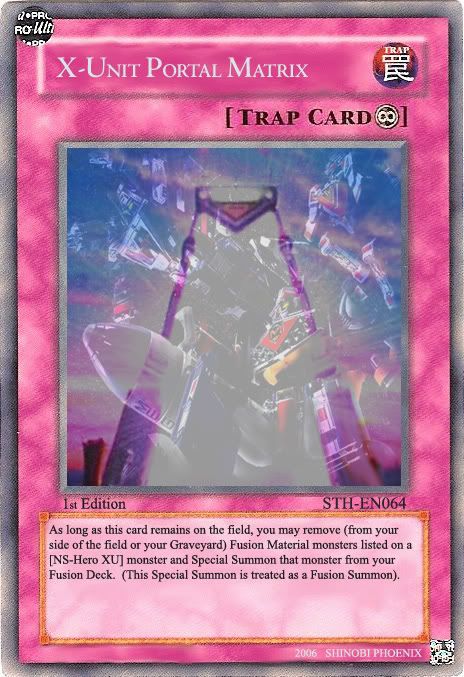 EFFECT: As long as this card remains on the field, you may remove (from your side of the field or your Graveyard) Fusion Material monsters listed on a [NS-Hero XU] monster and Special Summon that monster from your Fusion Deck. (This Special Summon is treated as a Fusion Summon).
