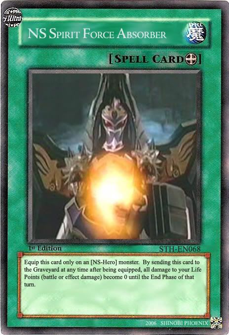 EFFECT: Equip this card only on an [NS-Hero] monster. By sending this card to the Graveyard at any time after being equipped, all damage to your Life Points (battle or effect damage) become 0 until the End Phase of that turn.