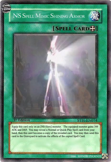 EFFECT: Equip this card only on an [NS-Hero] monster. The equipped monster gains 300 ATK and DEF. You may reveal a Normal or Quick-Play Spell card from your hand, then this card becomes a copy of the revealed card. You may then send this card to the Graveyard to activate the effects of the copied Spell Card.