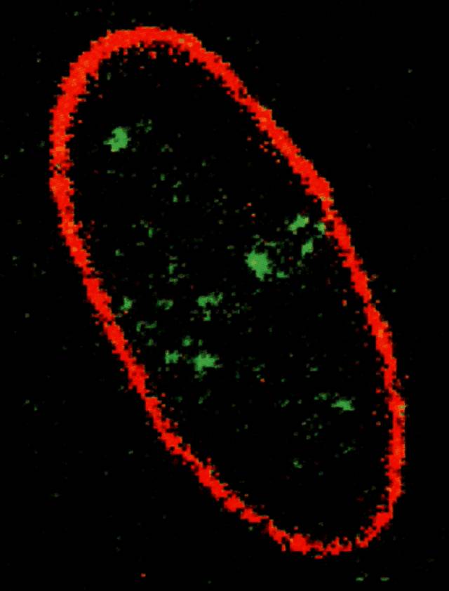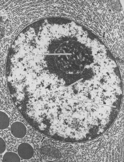 The nucleus is the command center of the cell. It consists of the nucleolus, surrounding fluid, and an outer layer called the nuclear membrane. The nucleus is where the cell's DNA is stored. It is a membrane-bound organelle that houses the chromosomes of the cell. It is represented as a dark spot in the pictures taken of the nucleus under a microscope. The first picture shows a 3d graphic of the nucleus and related parts. The second picture is of the nuclear membrane (shown in red). The third picture shows the nucleolus. In the other two pictures the nucleus is the bright yellow, and the dark gray blob in the upper right of the cell.