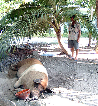 The Quarantine office here is down a little track behind some pig pens. The pig was the only one home when we visited on Monday morning – a huge guy (a good 9 feet long) with so many rolls around his face it was hard to find eyes or snout. We wondered if his legs would even hold him or if he just lay permanently in the shade of the big breadfruit tree, which only barely covered him. Oh well, we weren’t sick and we’d eaten all the fresh stuff anyhow.