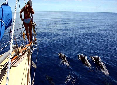 Marc jumped in his dinghy and zoomed out to the school. They immediately took up the challenge, leaping out at the bow in twos or threes. He herded them back to us, and we watched with snorkels from the peanut gallery as they passed close to us. But coming close seemed to spook them again and they moved further away. Tiri took a turn in the dingy and soon appeared to be drifting far out on the horizon. We thought it best to take Blue Moon over in case she had run out of gas. No, she was just drifting there with dolphins coming up all around her for a look. The pack played around our bows again and it was so frustrating not to be able to just jump in and play with them. Eventually we were hot again and stopped for another swim. This time a few came a little closer, feeling a little more comfortable with us after over an hour of play.