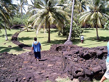 The chief at Gahi took us on a tour of the island last Sunday. This came about because we had asked how to find the Tongan ruins, Kolo Nui, which we heard dated back to the original settlement of the island by people from Tonga, so he offered to show us. With the chief, we visited the ruins of a fort, which we thought to be 'Kolo Nui' but he explained this was instead the 'palace' for the Wallisian king in 1500. He told us that the Wallisians were here before the Tongans. He took us to another set of ruins, on the west side of the island, which he said were the Tongan ruins. The first site we visited had been well kept, even planted, the rocks cleared and the structures maintained.