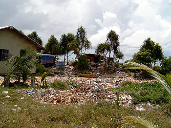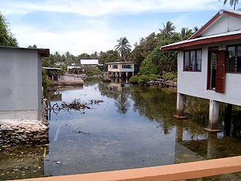 Funafuti is just a strip of sand, barely wide enough for a house on one side of the road. The largest part of the island is taken up by the airstrip, a legacy of the American occupation during WWII, when they paved the taro pits thereby eliminating the major food source for these people and immediately rendering them dependent on foreign aid. Another feature of life on Funafuti are the munitions pits also left over from the war, now festering swamps lined with pig pens that drain into them and filled with garbage. Unbelievably, houses are perched right on the edges of these, with the inhabitants seemingly unaware of the garbage and the health risk that must be prevalent in this situation.