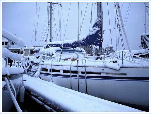We arrived in Victoria on the first of October, where we found a cozy berth right in the heart of downtown. It didn't take long to round up enough bodies for a decent party for Blue Moon's 20th birthday (and Rob's 60th). I landed a job within a month, only 6 blocks from our marina, back in the financial planning field. My second week at work we were deluged by 'the Pineapple Express', a weather system from Hawaii known for it's warm temperatures and heavy rain. Out came the gum boots. The next week we had the most snow seen here in 10 years. Blue Moon became an ice cave, with a snow drift completely covering our side deck, above the height of the taff rail. She built her own ice sculptures in the rigging, and then amused herself by flinging snowballs at us from aloft. Giant icicles hung from the scuppers. The statistics for November said we only had 74 hours of sunlight.
