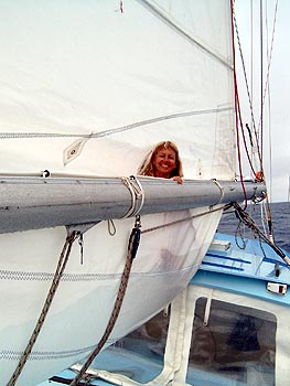 Our arrival in Wallis Island was a bit nerve wracking. We had left Asau Harbor on Savaii (Samoa) an hour after Opus 4. By nightfall, we had the Inter-Tropical Convergence Zone (ITCZ) descending on us, which meant rain squalls and fickle winds. One minute we were reefing down doing 10 knots, the next we had the motor on. Thankfully it was a short passage (only 220 miles). During one of these weather changes, we had a particularly heavy squall, with no wind, so we were motoring with the reefed main tied in. Because of the way it was tied, the rain water collected in the loop of sail from the reef. By the time we noticed, there was a ton of water there. Rob's first thought was lets have a bath, so we did. We climbed into the sail and had a lovely soak, until the wind came up and we started rolling. With the sail flapping, it was like being in a washing machine. End of bath! Now, how to get the water out? It was impossible to lift or move the sail. We had to let the whole main down on the deck to let the water run out. We were sailing again, and just the right speed for tuna - we caught two - a skipjack and a frigate.