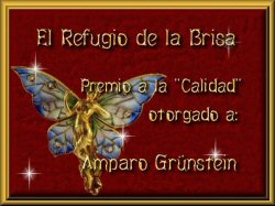 Me he dado un paseo por tu página y he de darte la enhorabuena porque es preciosa, por ello, y si me lo permites, quiero hacerte entrega de dos de los premios del Refugio y son: "El Refugio de Oro" y el "Premio a la Calidad" Recibe un afectuoso saludo. Brisa