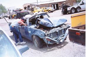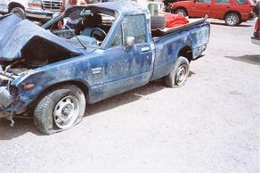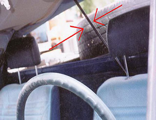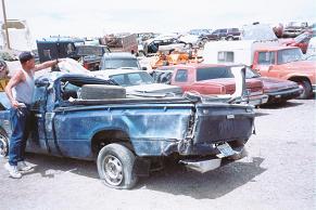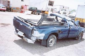 The truck rolled four times at Seventy miles per hour. I was lucky to be able to hobble away from the truck after it stopped. I hurt my shoulder, badly bruised my leg and had thirteen (at last count) cuts in my head. There was a pole that went to my jack that, along with my seatbelt, saved my life. You can see it stabbed into the roof of the cab in one of the following pictures. I made a pretty red arrow so you can see it.
