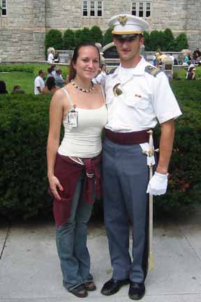 After much of the boringness that comes with any military parade it was finally time for the companies to march for review and then leave the Plain. I got this swell picture of Ziga's company (B3 "Bandits") just after they passed the review stand. This was Ziga's first parade as a Firstie (the West Point term for "senior," short for "First Class") and amazingly enough, not only could I pick him out in the sea of soldiers, but he's actually quite visible in this picture, due to the fact that he's a Platoon leader and thus in the front line. He's the one that's on the end on the right. Here, I'll pick him out for you: ![]()