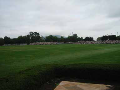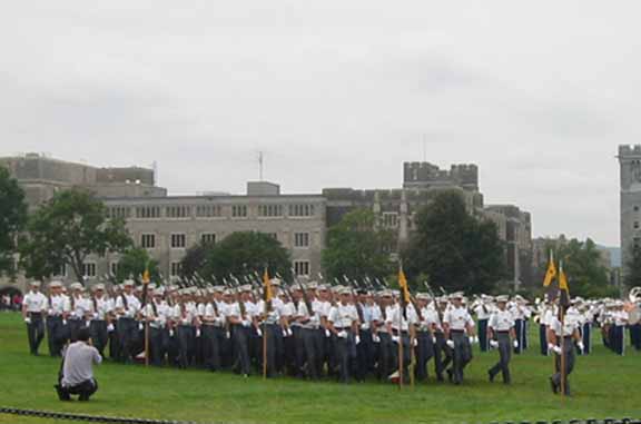 Acceptance Day is the day when the West Point New Cadets are officially accepted into the Corps of Cadets, thus becoming Plebes (the West Point terms for first-year student). This picture shows the huge crowd of parents, family, girlfriends, boyfriends, and well-wishers that turned up for the event this fall. It also shows the Plain, the huge grassy lawn on which all the official parades take place. You can see the path down which the companies walk along the edge of the lawn - the grass is trampled down.
