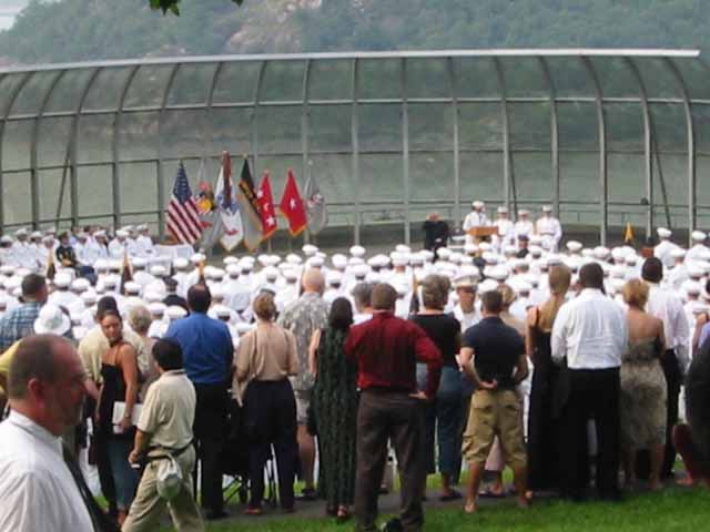 It was humid as all hell and shortly after this picture I gave up trying to see anything and laid myself down in the grass. Luckily I had opted not to wear my evening gown to the ceremony. Others were not so wise. After some important speech-making and singing the rings were handed out (at the time it seemed endless but now I realize it was quite quick considering a thousand rings were distributed) and then the command was given for the cadets to "don their rings." At which point we all cheered because there was finally hope of removal to a less oppressively humid location.