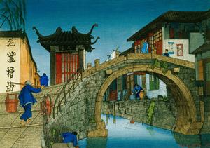 Watanabe encouraged Keith to work with wood block cutters to translate her watercolours into prints. Elizabeth Keith’s first large scale exhibition of her paintings and watercolors took place in 1919 at the Peers Club, Tokyo. Her art quickly came to the attention of the leading publisher of Shin Hanga art, Shosaburo Watanabe, who convinced Keith to work upon designs for woodcuts. Her first woodblock print, East Gate, Seoul, by Moonlight was published by Watanabe later that year. From her association with Watanabe, she knew the woodblock artists Hasul, Yoshida and (13-2, p. 37) Shinsul.