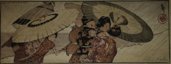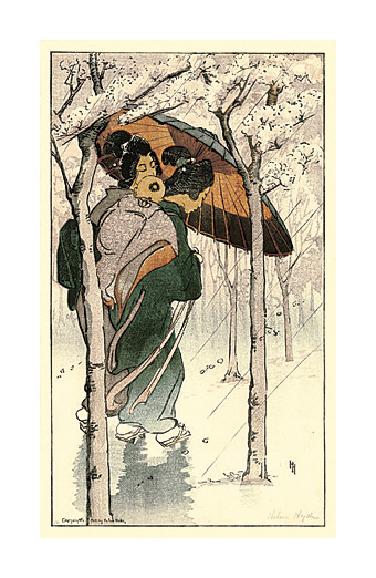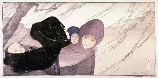 In 1890 Helen Hyde came to Europe, first a year in Berlin and then she spent three years in Paris, which at that time was considered the center of the fine arts world. She also spent several monthes in Holland and England. It was the period when the French impressionists had finally been accepted by the public after a long struggle. And it was the period of Japonism in France - a craze for everything Japanese, especially Japanese woodblock prints. In 1899 Hyde went to Japan where she rented a home in Tokyo, where she lived and worked. She studied with Kano Tomonobu, the last master of the Kano school of painting. She remained in Japan for 15 years.