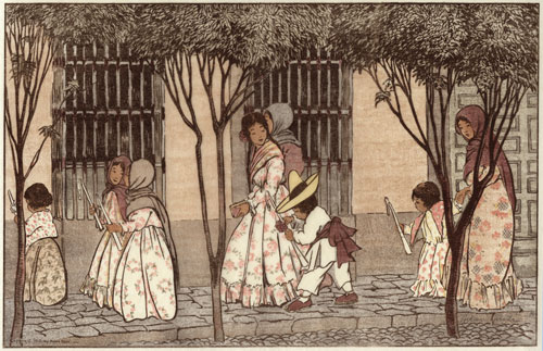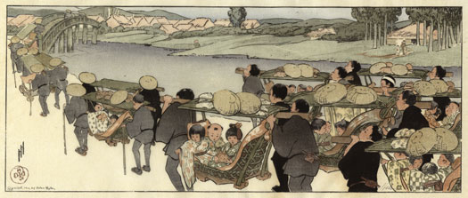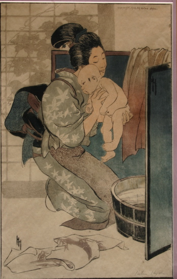 After returning to Japan in 1912, Hyde remained only two more years. During that time, despite her declining health, Hyde continued to keep up a prodigious output of work, including woodblock prints, etchings and aquatints. In 1914, Hyde closed her Tokyo home and returned to the States to live with her sister in Chicago. Although she continued to produce etchings on her own, she could no longer produce woodblock prints without her carver and printer. Hyde lived and worked in Japan for most of her adult career and produced a sizable body of works largely depicting charming images of children.