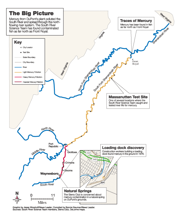 The Chemical Company, Du Pont, stationed in Waynesboro, VA, used mercury to help process fiber for many years. From 1929-1950. There were lacks regulations on Mercury during this time period. Due to these lacks laws on the management of mercury, the substance was allowed to seep into the South Fork of the Shenandoah River.