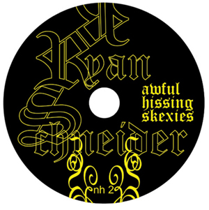 Awful Hissing Skexies (nh2 this recording has over forty five minutes of poetry tracks - 1- 2- blackout rules 3- boyhood 4- a toast 5- letter to the states 6- bright turdlet 7- let us take a moment to recall those parts of us that died 8- tripping 9- mattress 10- you forget nothing ever 11- I always write about the same things 12- the nude riot 13- Madonna blowjob 14- the numb 15- the one and only snow of this long ass winter 16- I will help you destroy this, world 17- listen to:: 'Madona Blowjob' Ryan Schneider is an artist and writer living in NYC. Open City published his first work in their winter edition in 2004 and he has participated in several group shows and readings in Baltimore and NYC. Awful Hissing Skexies is his only record. |