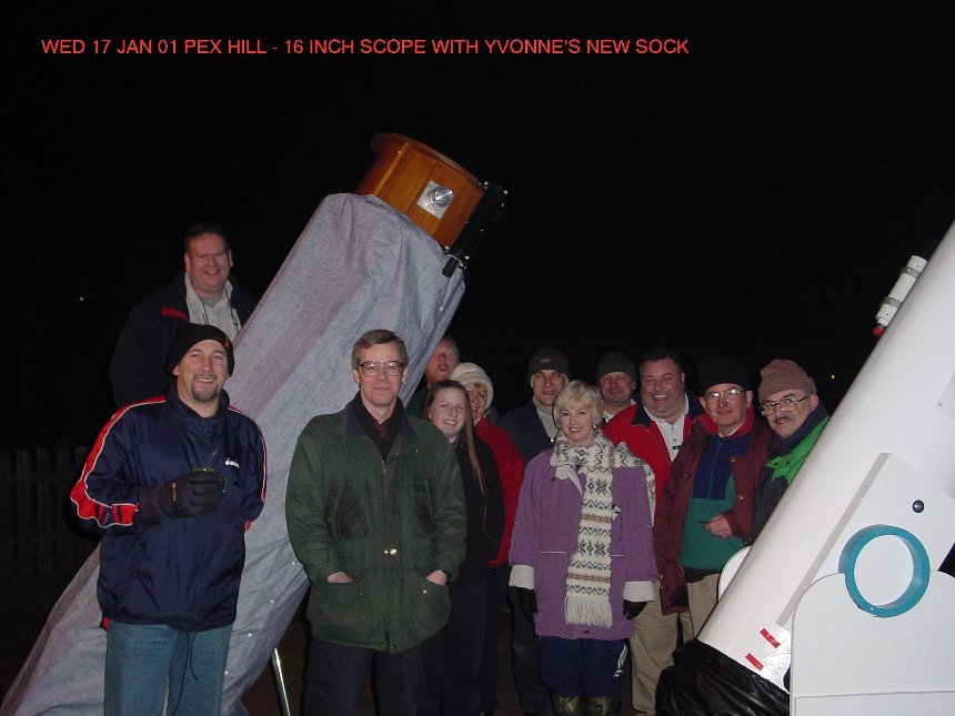 Jim Stacey arrived at about 19:20 and quickly set up his 8 inch Goto reflector. Both telescopes then waited for the first bright deep sky object or double star to become visible. At this point I noticed that the 16 inch seemed slightly too top heavy and was slipping in altitude, probably due to the extra weight of the extension tube used to focus on the nearby streetlamp. A bag of coffee and mugs, suspended off the back end of the scope, soon cured that problem.