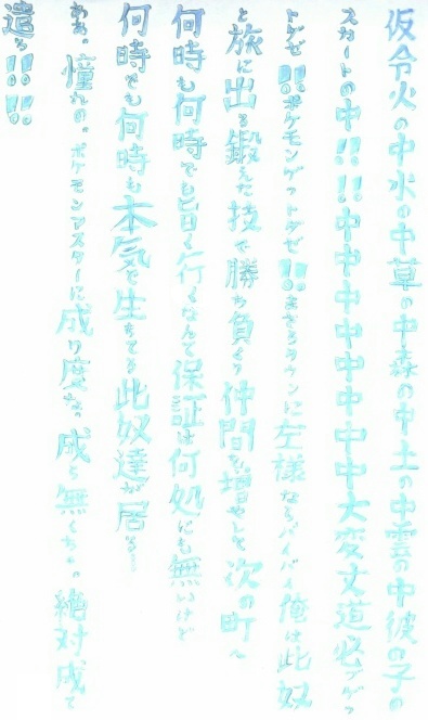 Pokemon - Getto daze! Tatoe hi no naka Mizu no naka Kusa no naka Mori no naka Tsuchi no naka Kumo no naka Ano ko no sukaato no naka! Nakanakanakanaka Nakanakanakanaka Taihen dakedo Kanarazu getto daze Pokemon – Getto daze! Masara taun ni sayoonara bai bai Ore wa koitsu to tabi ni deru (Pikachu!) Kitaeta waza de kachi makuri Nakama wo fuyashite Tsugi no machi e Itsu mo itsu demo Umaku yuku nante Hoshoo wa doko ni mo nai kedo (Sorya soo ja!) Itsu mo itsu demo Honki de ikiteru koitsu tachi ga iru Aa akogare no Pokemon masutaa ni Naritai na Naranakucha Zettai natte yaru!! |