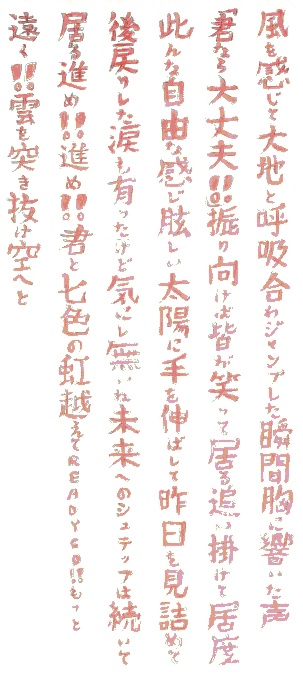 Förnimmande vinden förenar jag mig med jorden I mitt hopps ögonblick I bröstet ekade höstet "För dig ska det gå bra!" Jag ser tillbaka och alla myser Jag vill hålla i en sådan här fri känsla Efter den blossande solen sträckar jag handen Strirrande gårdagen längtade jag tillbaka Där har okså funnits tårar men bekymra dig inte Framtidens steg fortsättar Vidare! Vidare! Med du ska jag gå över den sjufärgade regnbågen Färdig, gå! Längre bort! I molnen kommer vi, också i himmelen |