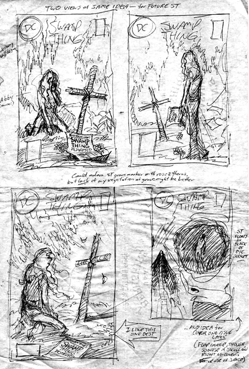 Click on image at right to enlarge Bissette's original sketches for this issue's cover. (The sketch in the lower right was used for the cover of issue #56.) The handwritten notes say "Could adorn ST gravemarker with rose & thorns, but lack of any vegetation at grave may be better". The sketches on the left have a newspaper that says "Gotham Times, Swamp Thing Destroyed". The newspaper in the sketch at upper right says "Swamp Thing Dead". On his blog, Bissette says these are some of his favorite SWAMP THING covers which he did. His first wife Marlene (then Nancy) O'Connor posed for him.