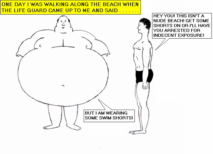 I love being fat! I love the sensation of all that flesh, and the sensation of heaviness on my feet and legs as I carry all that weight around. Obesity really turns me on! I enjoy looking at fat people walking along the street, and I especially enjoy seeing fat people on the beach. It would be a rather dull and uninteresting world if there were no fat people in it, if everybody were thin, or normal, because to me all thin or normal people look pretty much alike. But if there were only fat people in the world, it would be even more interesting. That is because fat people come in a wide variety of different shapes.