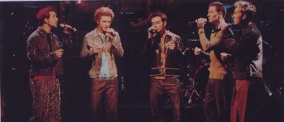 They performed “BBB” and after looking at the tape again you could see Lance hopping on his right leg during the jumping parts of “BBB.” He’s so brave…hehehe! He must have been in such pain, but he still went on…you go Lance! Okay, I have to comment about their attire, well, Lance and Joey’s pants and Justin’s jacket. Hello!!! The 80s is over. JC and Chris were looking good, but I dunno what the other three were thinking. I think they got caught in some evil time warp.