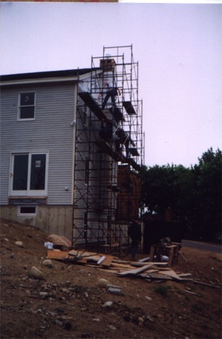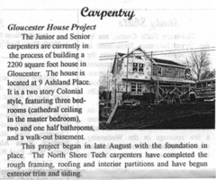 This site I've worked on with Carpentry Students in my shop, Ryan from the **Battle Page** is in my shop along with Tim Marquis and Paul Gorman from the **Hall of Shame** page. We weren't fast, the kids were gross, perverted, and rude, but I learned a lot, some from just doing it, a lot from learning from Mr. Bernards Mistakes-and resenting him for the full year for being sexist, and forgetful, and for blaming others for his mistakes. I will probably put up an Anti-Mr. Bernard webpage, but not now. I'm sick to death of everyone in the shop except Holli McRae, Tom Applin, Scott Duffy, and Eric St. Hilaire (the father in my fame page-ohh I'll update that page soon)![]() This was published in the newspaper. In case you can't read the article-it reads as follows: "The junior and senior carpenters are currently in the process of building a 2200 square foot house in Gloucester. The house is located at 9 Ashland Place. It is a two story Colonial style, featuring three bedrooms (cathedral ceiling in the master bedroom) two and one half bathrooms, and a walk-out basement. This project began in late August (1999)with the foundation in place. The North Shore Tech carpenters have completed the rough framing, roofing, and interior petitions and have begun exterior trim and siding." The reason it took so long to build is A) Mr. Bernards sheer stupidity. B) We're students C) All the seniors except for Gideon arent bright enough to pass arithmetic, let alone tie their shoes. D)Ricky Hart, Tim Marquis, Brian Newman and Paul Gorman-Need I say more? E) We have a 6 day rotation-so we're only working at the jobsite half the year, and the rest, we're in class. ![]() This is the front left side of the house. All the siding on the first floor Tom and I put up, and Tom, Mat, Ryan, and I put in all the windows on the first floor. Tom and I put up all the cornerboards on the entire house, the trim on the gable ends were put on during rough framing by pretty much everybody. The trim on the porch was done mostly by Holli and Mat or Tom and I. As you see the difference in coloration of the clapboards-its just primer, it'll be painted over anyways. ![]() Here is a view of the scaffolding on the back, the only side of the house Tom and I didnt put up any siding. This is the infamous chimney that was such a pain. First the owner wanted it on the back. Then before construction he decides, he wanted it on the side you see here. We frame for a chimney-and he decides he doesnt want a chimney at all! So we build in the areas we had cut out, and built a double wall in the basement. Then when schools about to end he decides yeah he wants a chimney-but he doesnt want it to go all the way down to the ground, so Duffy has to cut out chunks of the wall and the floor joists and stand on basically nothing to build this chimney that wasnt worth the trouble. Duffy is standing up in the black sweatshirt. The blue blob on his knees next to Duffy is Bernard. Sitting on the Chimney slops in a black sweatshirt and beige pants is Lingren. Ryan is in a T-shirt leaning over them. BTW, this is the dumpster Ryan was standing in (Battle Page) ![]() This is the Kitchen, I really should have taken pictures BEFORE the drywall was up-but no, I didnt bother. SIGH. To the left of the picture, theres a sliding door, an interior petition with a doorway into the living room, and another sliding door. Due to the lateness of all these photos, I didnt get a picture of any framing. I appologize. ![]() This is the living room from that doorway with the sliding doors at my back. The double window you see is the one in the front-the one in the newspaper article (firstfloor) The guy who did all the hardwood flooring was wicked quiet and wicked old and wicked fast. Heres a shot of the grooved knotty pine Tom and I put up. You can see from the dark triangle corner that it's not finished yet. We ran out of wood, and we had to measure and cut around the light fixtures-PAIN IN THE ARSE! The trim along the porch deck and porch roof Tom and I put up, the trim along the poles mostly Holli and Mat did, although two were done my Tom, Mat and I. Heres the unfinished section of knotty pine. The picture is actually on its right side, but I thought you might figure the 'L' shape of the porch out better with the picture this way. See the door and wondow? Try to figure it all out-I dare ya! ![]() The stairs down to the front door (directly in front of the stairway. The corner of window you see is the main front window in the news article-if that helps any. ![]() The basement. Now this stair points towards the front end of the house, and is directly under the other staircase, so this wall is the inside view of the left side of the house (with all the scaffolding) This is the double basement wall that Holli and I put up. ![]() This is the right side of the house-directly under the porch overhang is the area of siding that gave us the most trouble-because Mike Firmani did it, and didnt bother looking at the story pole, and it messed EVERYTHING up. It looks okay in this shot, but the reveal goes somethng like this 3 1/4" then 4 1/2", 4 1/4", 3 1/4", 3 7/8", 4"-no order at all! As politely as I can say this-MIKE IS A MORON ![]() This is the main section of the master bedroom, it extends farther back into a large bathroom with a jacuzzi and walk-in closet. This is the catherdral ceiling-oooo ahhhh, whoopty do and all that jazz. ![]() This is the back left corner of the house. The side with the scaffolding-that is the only side that Tom and I didnt put up any clapboards. The sliding door you see here, Tom and I put up. Incase I didnt mention it earlier-We're partners, throughout the year we've been assigned to work as a team. Some of the guys switched around, others always worked together, like Mat and Holli always worked together. Lingren and Duffy always worked together, Tim, Eric, Gorman, Brian, Ricky, and Ryan floated around. Lingrens walking on the ground, Tyans leaning forward, 